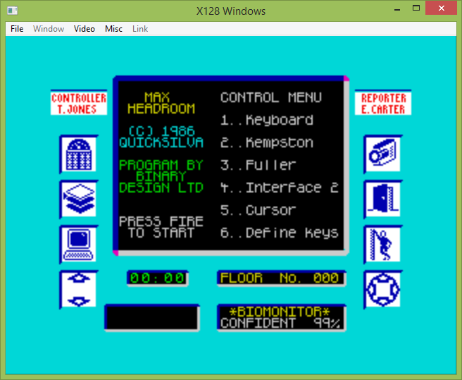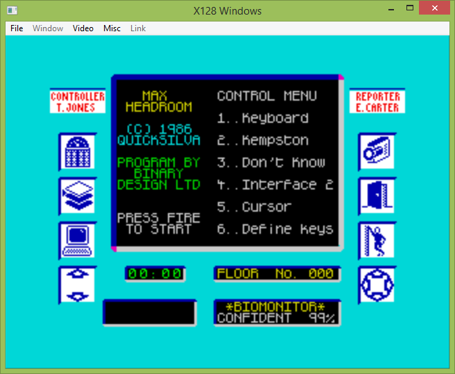 Max Headroom (Quicksilva/Binary Design, 1986) offers all the usual control options of a ZX Spectrum game from that time. Keyboard, Define keys, Kempston, Interface 2, Cursor, and Don't Know. Huh..? "Don't Know"?